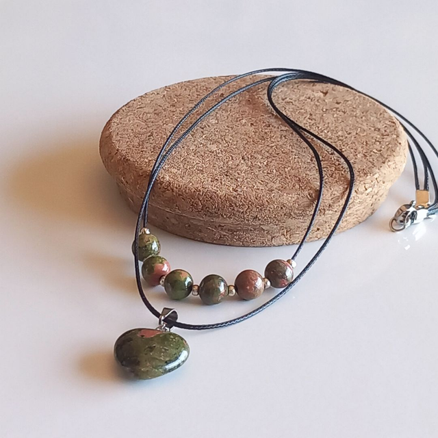 Collier double en Unakite, forme coeur et perles en pierre naturelle 6 mm